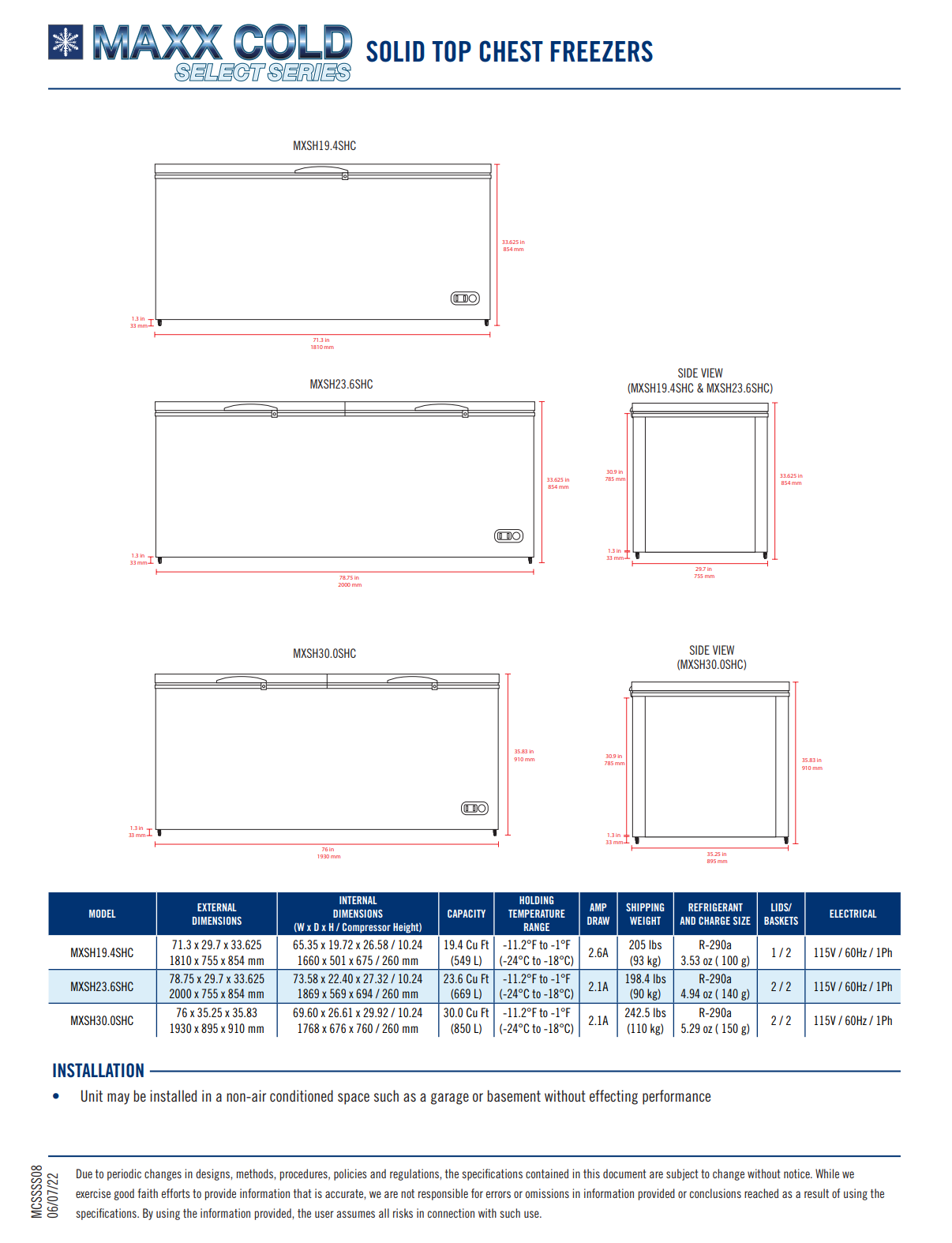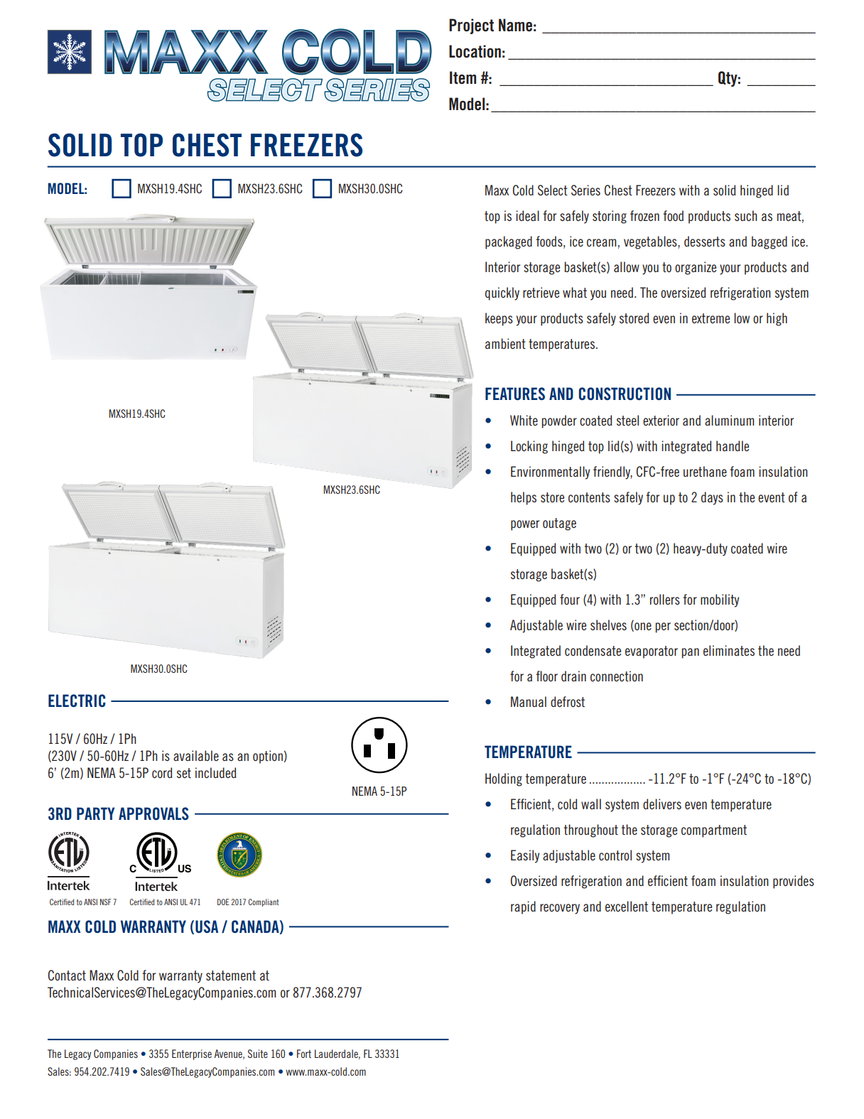 The Maxx Cold Select Series Chest Freezer with Split Top is excellent for safely storing frozen food such as meat, packaged foods, ice cream, vegetables, desserts and bags of ice. The subzero chest freezer keeps frozen food products at the ideal storage temperature to maintain quality and taste, extend product life, and prevent freezer burn and ice crystals. This commercial deep freezer has a storage capacity of 23.6 cubic feet, and the double-top lid design offers easy access to the frozen food products. The included interior storage baskets help you organize your products, allowing you to locate and retrieve what you need quickly. The oversized refrigeration system keeps your products safely stored even in extremely low or high ambient temperatures. The hinged lid includes a lock and key to prevent unauthorized access to the contents. The commercial chest freezer will provide years of reliable operation if properly maintained, and its white-coated exterior is easy to wipe down and clean. Perfect for convenience stores, concession stands, ice cream shops, restaurants, bars or your home. Covered by the Maxx Cold One-Year Parts & Labor + Five-Year Compressor (Part Only) Warranty.