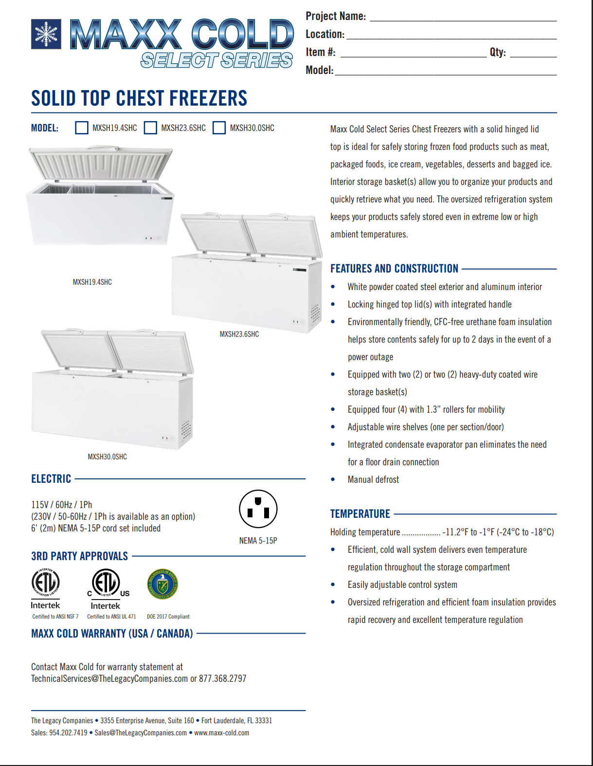 The Maxx Cold Select Series Chest Freezer with Split Top is excellent for safely storing frozen food such as meat, packaged foods, ice cream, vegetables, desserts and bags of ice. The subzero chest freezer keeps frozen food products at the ideal storage temperature to maintain quality and taste, extend product life, and prevent freezer burn and ice crystals. This commercial deep freezer has a storage capacity of 30 cubic feet, and the double-top lid design offers easy access to the frozen food products. The included interior storage baskets help you organize your products, allowing you to locate and retrieve what you need quickly. The oversized refrigeration system keeps your products safely stored even in extremely low or high ambient temperatures. The hinged lid includes a lock and key to prevent unauthorized access to the contents. The commercial chest freezer will provide years of reliable operation if properly maintained, and its white-coated exterior is easy to wipe down and clean. Perfect for convenience stores, concession stands, ice cream shops, restaurants, bars or your home. Covered by the Maxx Cold One-Year Parts & Labor + Five-Year Compressor (Part Only) Warranty.