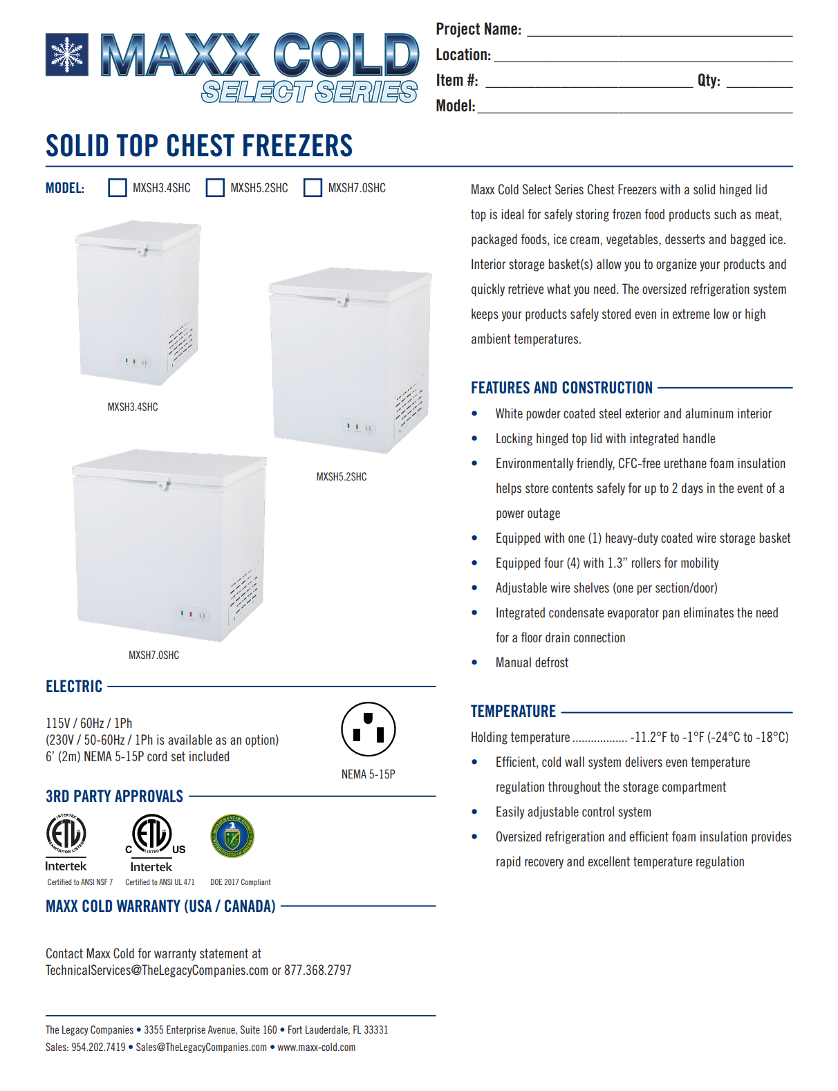 The Maxx Cold Select Series Compact Chest Freezer with Solid Top is excellent for safely storing frozen food such as meat, packaged foods, ice cream, vegetables, desserts and bags of ice. The subzero chest freezer keeps frozen food products at the ideal storage temperature to maintain quality and taste, extend product life, and prevent freezer burn and ice crystals. This space-efficient commercial deep freezer has a storage capacity of 5.2 cubic feet and offers easy access to frozen food products. The included interior storage basket helps you organize your products, allowing you to locate and retrieve what you need quickly. The oversized refrigeration and efficient foam insulation provide rapid recovery and excellent temperature regulation. The hinged lid includes a lock and key to prevent unauthorized access to the contents. The commercial chest freezer will provide years of reliable operation if properly maintained, and its white-coated exterior is easy to wipe down and clean. Ideal for commercial settings with limited space, the Maxx Cold Select Series Compact Chest Freezer with Solid Top is perfect for convenience stores, concession stands, ice cream shops, restaurants, bars, or your home. Covered by the Maxx Cold One-Year Parts & Labor + Five-Year Compressor (Part Only) Warranty.