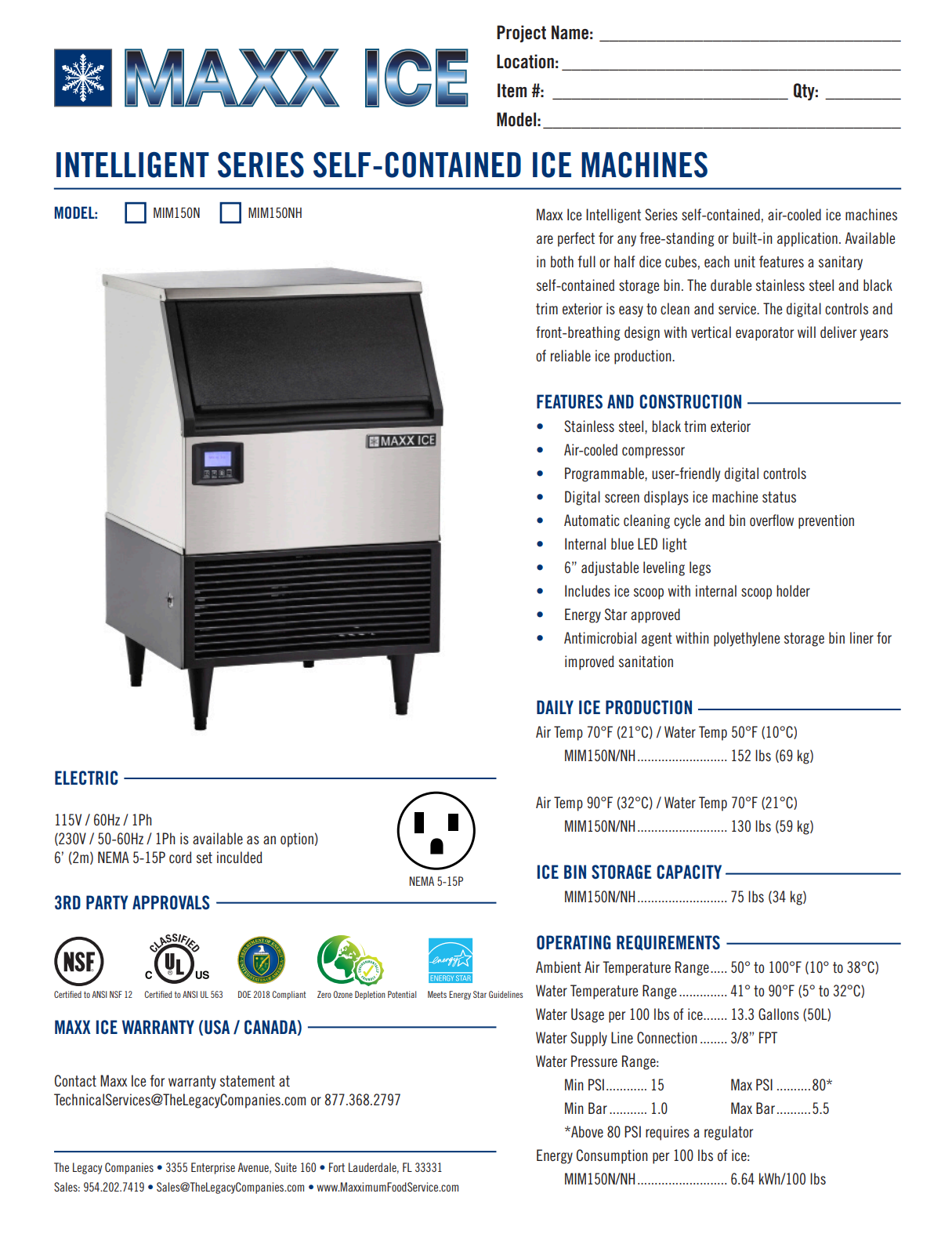 Be sure you always have plenty of ice available with the Maxx Ice Intelligent Series Self-Contained Ice Machine. Intelligent Series Ice Machines are designed to consume up to 40% less water than similar competitor units and produce ice up to 20% faster. Maxx Ice Intelligent Series self-contained, air-cooled ice machines are perfect for freestanding or built-in applications for foodservice, hospitality and entertainment industries. The durable stainless steel and black trim exterior is easy to clean and service. This commercial ice machine will produce up to 152 lbs (69 kg) of full dice ice cubes daily and has a storage capacity of up to 75 lbs (34 kg), providing the right amount of ice for restaurants, cafeterias, bars, bakeries and cafes. The polyethylene storage bin liner includes an antimicrobial agent for improved sanitation. The interior LED light illuminates the ice when the bin door is open. The digital controls and front-breathing design with vertical evaporator will deliver years of reliable ice production. Supplied with four 6” black leveling legs and 5-15P NEMA plug for easy installation. The ice maker meets UL and NSF guidelines and is available in 120V and international voltage upon request. Covered by the Maxx Ice One-Year Limited Warranty.