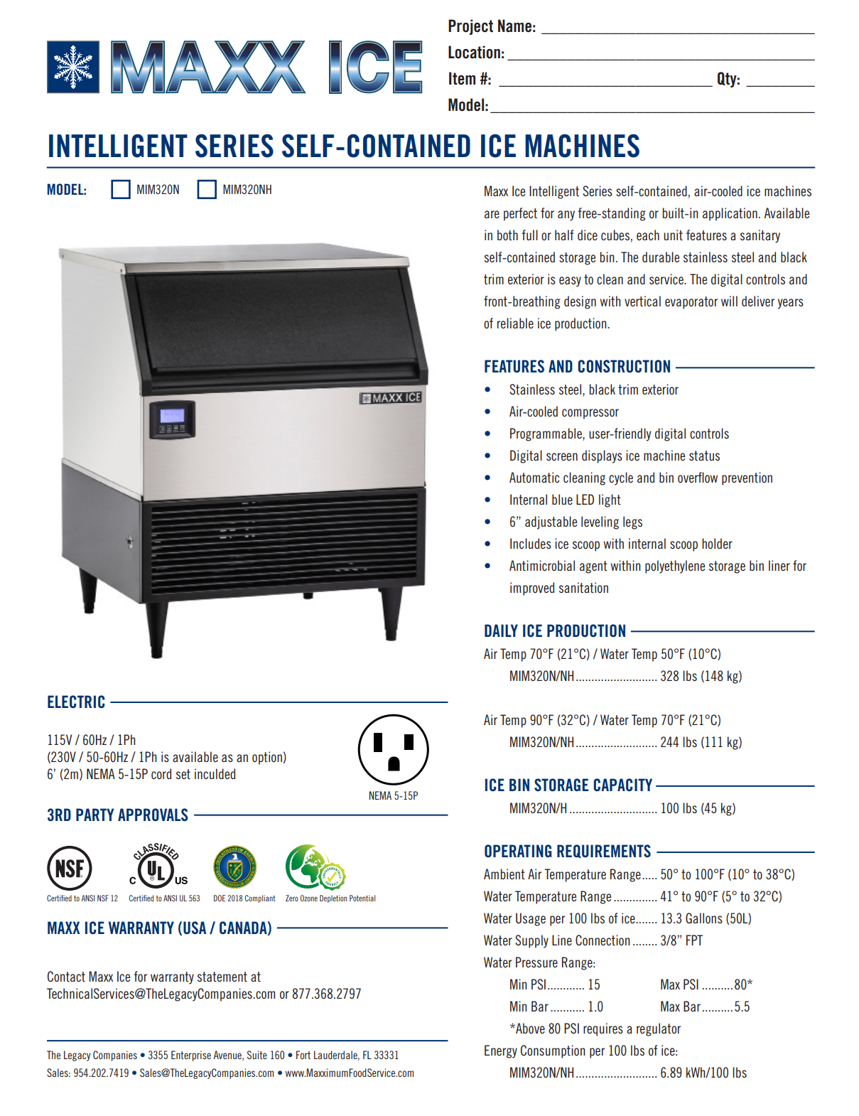 Be sure you always have plenty of ice available with the Maxx Ice Intelligent Series Self-Contained Ice Machine. Intelligent Series Ice Machines are designed to consume up to 40% less water than similar competitor units and produce ice up to 20% faster. Maxx Ice Intelligent Series self-contained, air-cooled ice machines are perfect for freestanding or built-in applications for foodservice, hospitality and entertainment industries. The durable stainless steel and black trim exterior is easy to clean and service. This commercial ice machine will produce up to 328 lbs (148 kg) of full dice ice cubes daily and has a storage capacity of up to 100 lbs (45 kg), providing the right amount of ice for restaurants, cafeterias, bars, bakeries and cafes. The polyethylene storage bin liner includes an antimicrobial agent for improved sanitation. The interior LED light illuminates the ice when the bin door is open. The digital controls and front-breathing design with vertical evaporator will deliver years of reliable ice production. Supplied with four 6” black leveling legs and 5-15P NEMA plug for easy installation. The ice maker meets UL and NSF guidelines and is available in 120V and international voltage upon request. Covered by the Maxx Ice One-Year Limited Warranty.