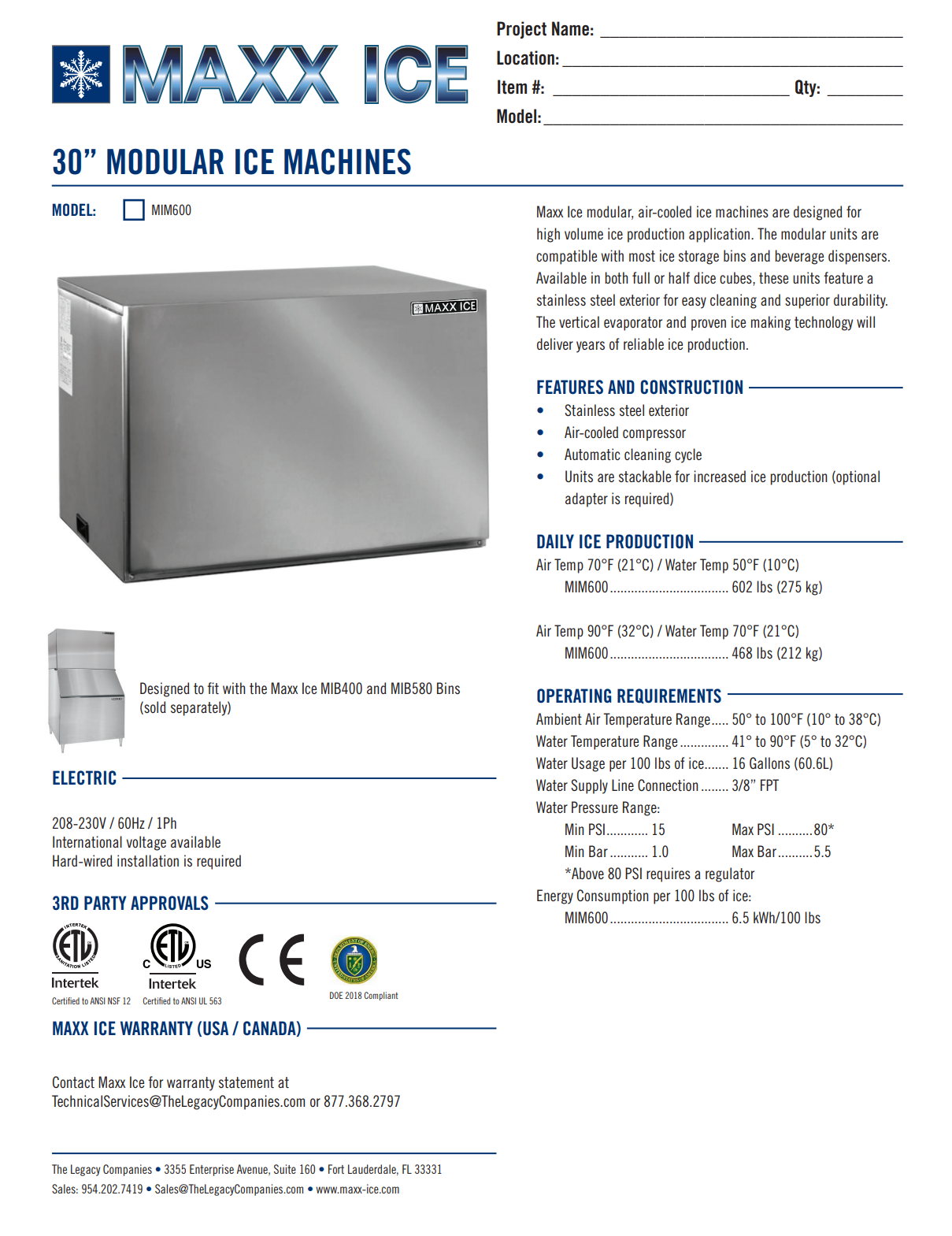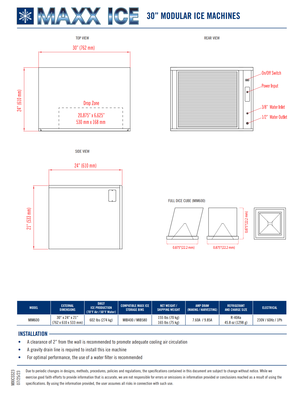 Designed for high volume ice productions, the Maxx Ice MIM600 Modular Ice Machine is ideal for restaurants, entertainment, hospitality, grocery, education and institution applications. Capable of producing up to 602 pounds of full dice ice cubes daily, this ice machine ensures you’ll always have plenty of ice on hand. This modular ice machine measures 30-inches wide and is compatible with most ice storage bins and beverage dispensers. The unit is stackable for increased ice production (an optional adapter is required). The stainless steel exterior is durable and easy to clean, while the hinged front panel allows for easy access and service. This unit uses an air-cooled compressor and features an automatic cleaning cycle, automatic shut off and bin overflow protection. To reduce melting and insure proper ice formation, keep the door closed when not removing ice. For years of reliable, high volume ice production, choose the Maxx Ice Modular Ice Machine.