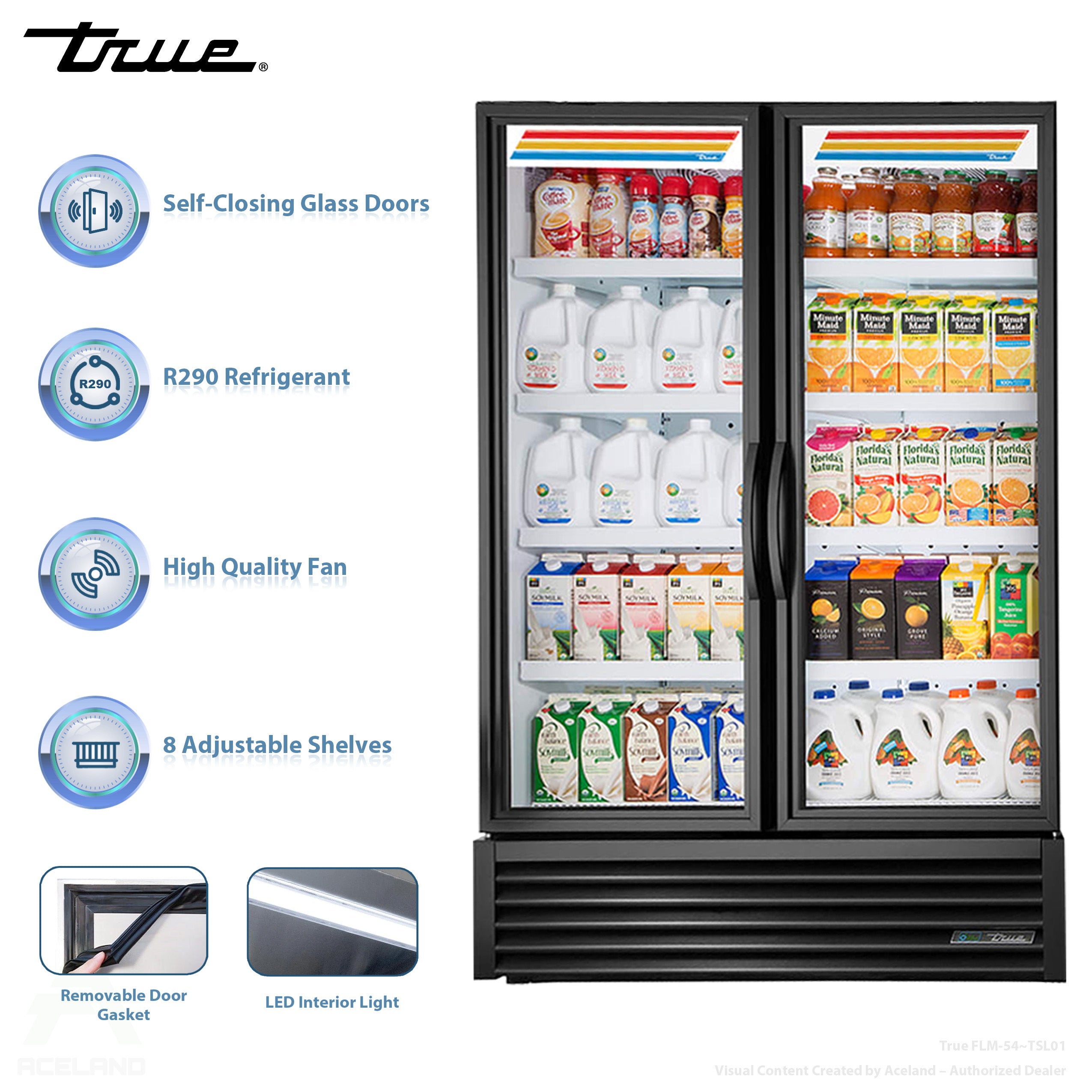 The FLM-54~TSL01 glass door merchandiser is built with high-density, foamed-in-place polyurethane insulation to help maintain stable temperatures and improve overall energy efficiency. Its self-contained refrigeration system requires minimal setup and operates with eco-friendly R290 refrigerant. For service or cleaning, the condenser is positioned at the bottom of the unit for quick access. The merchandiser maintains temperatures between 33°F and 38°F, and both doors feature magnetic gaskets that create a tight seal to prevent warm air from entering the cabinet.