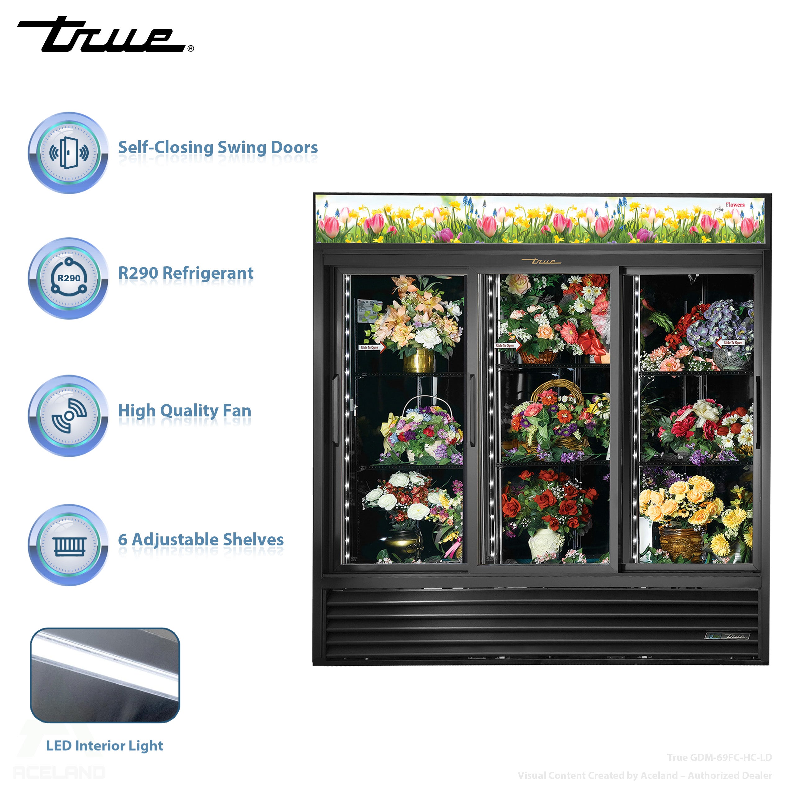 The True GDM-69FC-HC-LD is a three-section floral merchandiser designed specifically to keep bouquets and single-stem arrangements looking fresh longer. A baffled airflow system delivers gentle, low-velocity, high-volume air circulation that protects delicate flowers while the factory-engineered refrigeration system, using eco-friendly R290 hydrocarbon refrigerant, maintains a stable floral temperature of 35°F (1.6°C). The bottom-mounted condensing unit raises the lower shelf for easier product access and simplifies service.