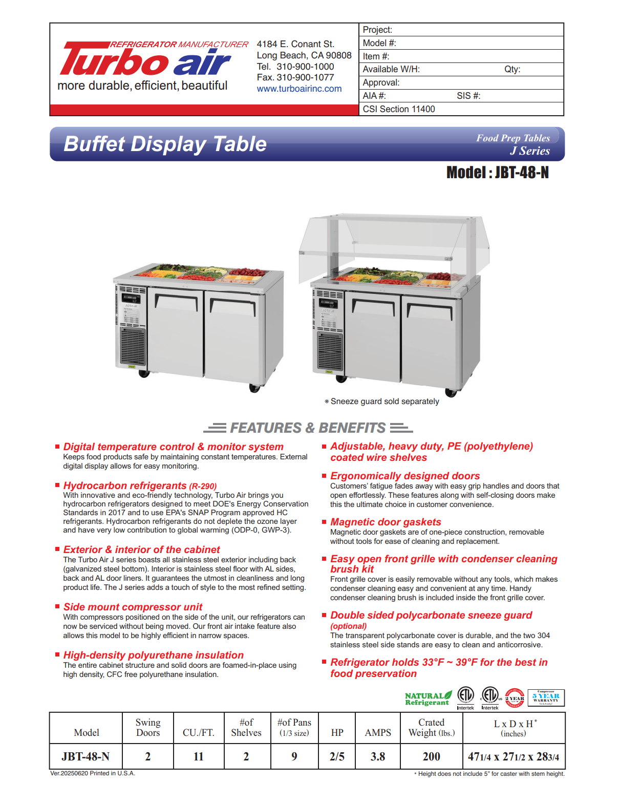J Series Refrigerated Buffet Table, two-section, front air intake, side mount self-contained compressor, 47-1/4″W x 27-1/2″D x 28-3/4″H, 11.0 cu. ft., (9) 1/3 size 4″ deep pans, (2) solid doors, (2) PE coated wire shelves, digital temperature control, stainless steel exterior (galvanized steel bottom), stainless steel interior floor (aluminum side, back, door liner), R290 Hydrocarbon refrigerant, 2/5 HP, 115v/60/1-ph, 3.8 amps, NEMA 5-15P, cETLus, ETL-Sanitation