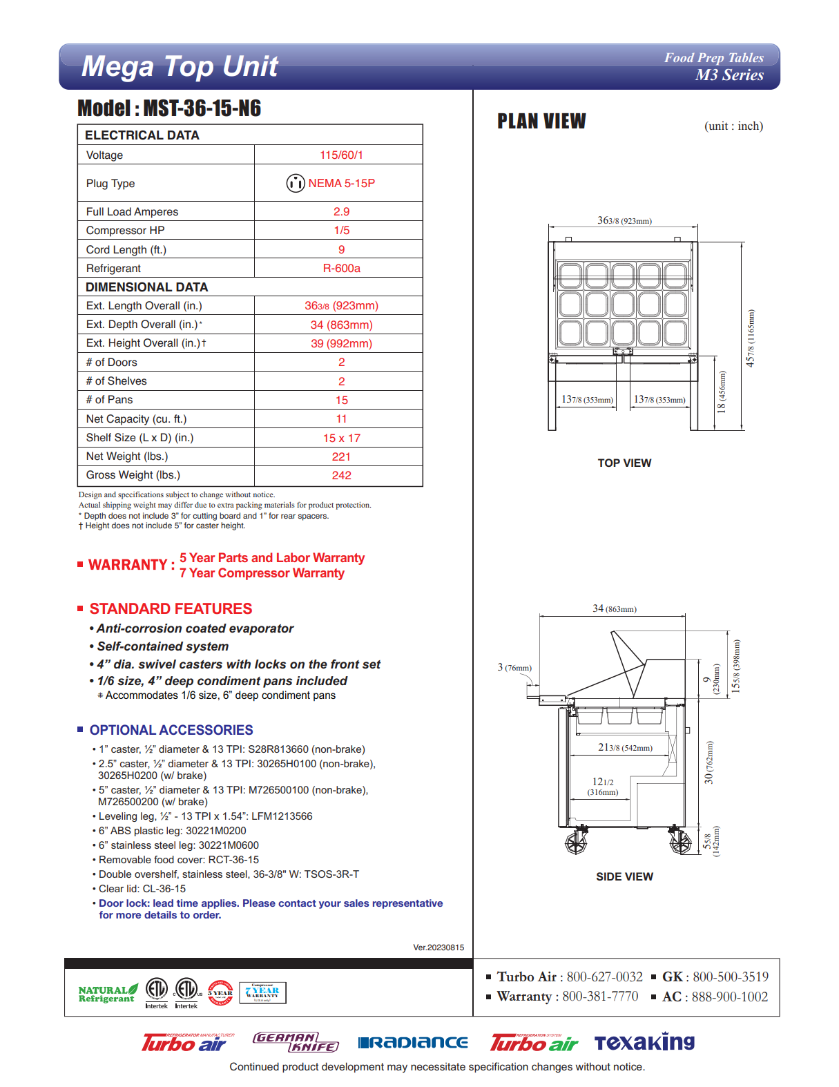 M3 Series megatop unit, Two-section, Self-Cleaning Condenser, Digital temperature control & monitor system, Cold Bunker system, Stainless steel top with refrigeration pan rail, LED interior lighting & fan control, (15) condiment pans included, 9-1/2″ deep removable HDPE cutting board, Stainless steel exterior (galvanized steel back and bottom), AL interior with stainless steel floor, ABS door liner, Insulated pan cover, (2) door with recessed handles, 4″ casters, Anti-corrosion coated evaporator, Self-contained, 11 cu.ft., 115v/60/1, NEMA 5-15P, 2.9 Amps, 1/5 HP, ETL-Sanitation, cETLus