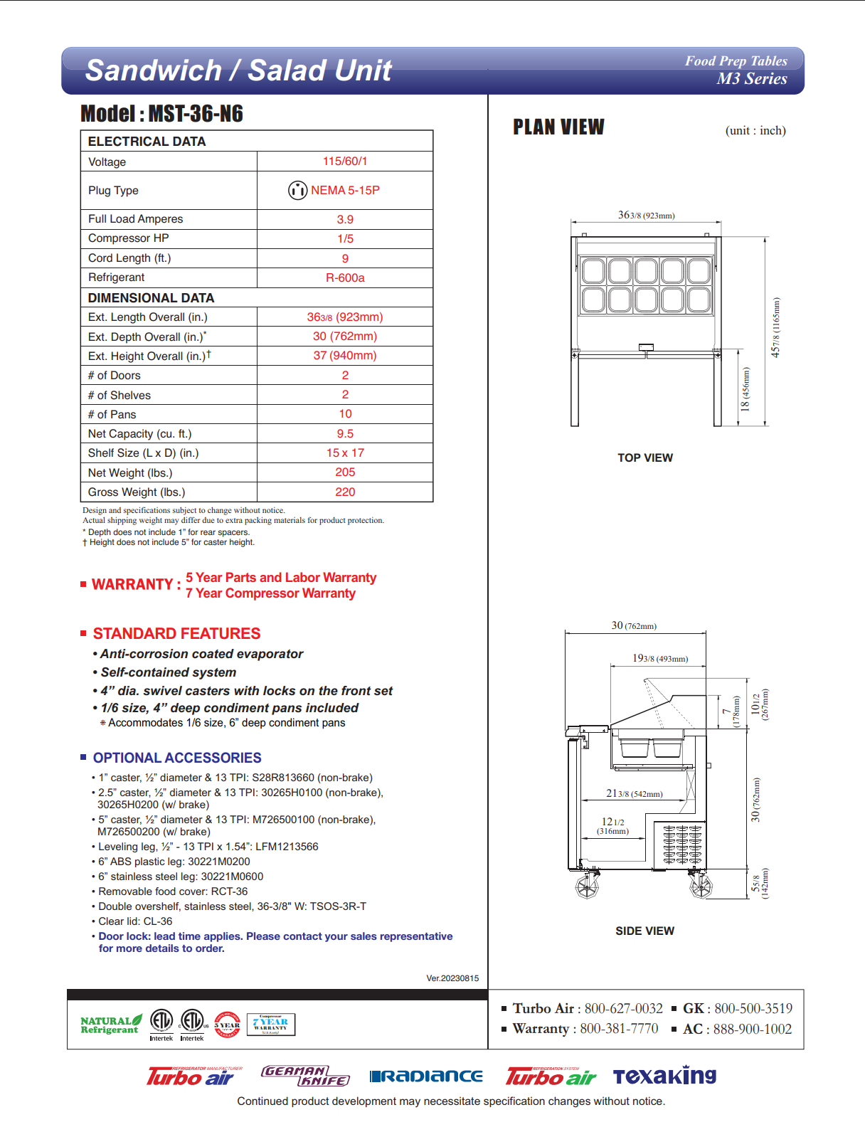 M3 Series sandwich/salad unit, Two-section, Self-Cleaning Condenser, Digital temperature control & monitor system, Cold Bunker system, Stainless steel top with refrigeration pan rail, LED interior lighting & fan control, (10) condiment pans included, 9-1/2″ deep removable HDPE cutting board, Stainless steel exterior (galvanized steel back and bottom), AL interior with stainless steel floor, ABS door liner, Insulated pan cover, (2) door with recessed handles, 4″ casters, Anti-corrosion coated evaporator, Self-contained, 9.5 cu.ft., 115v/60/1, NEMA 5-15P, 3.9 Amps, 1/5 HP, ETL-Sanitation, cETLus