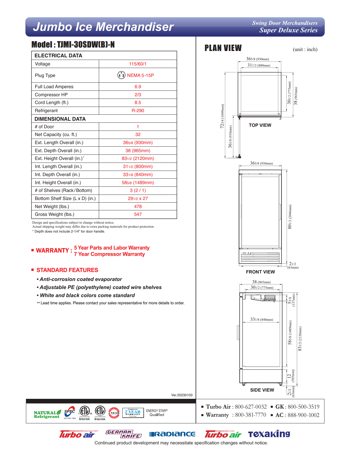 Super Deluxe Jumbo Ice merchandiser, one-section, 32 cu.ft. capacity, 36-5/8″L x 38″D x 83-1/2″H, bottom mount self-contained refrigeration, self-cleaning condenser device, digital temperature controller, self-diagnostic monitoring system, automatic fan motor delays, Turbo freezing, smart fuzzy defrosting, (1) triple pane heated glass door, LED interior lighting, (2) rack shelves, (1) bottom shelf, R290 Hydrocarbon refrigerant, 2/3 HP, 6.9 amps, 115v/60/1-ph, cord, NEMA-5-15P, cETLus, ETL-Sanitation, ENERGY STAR®