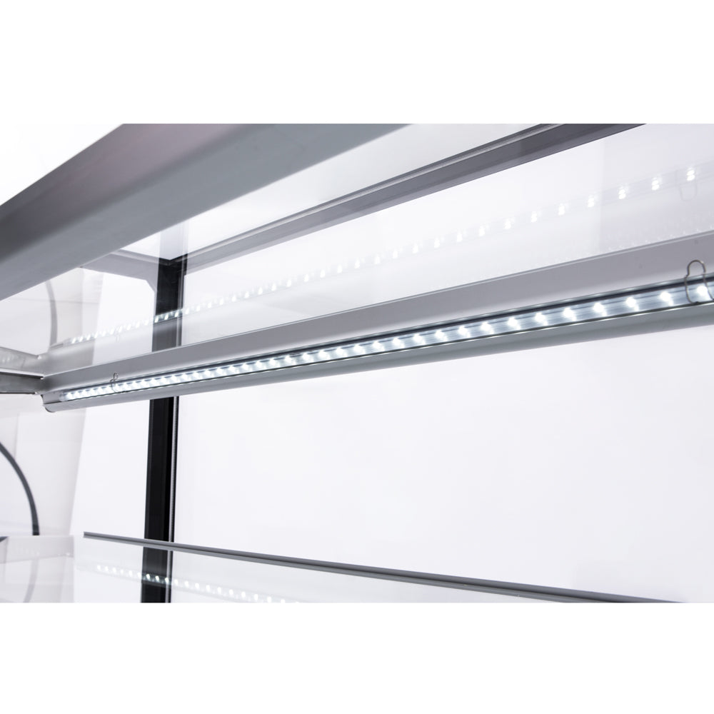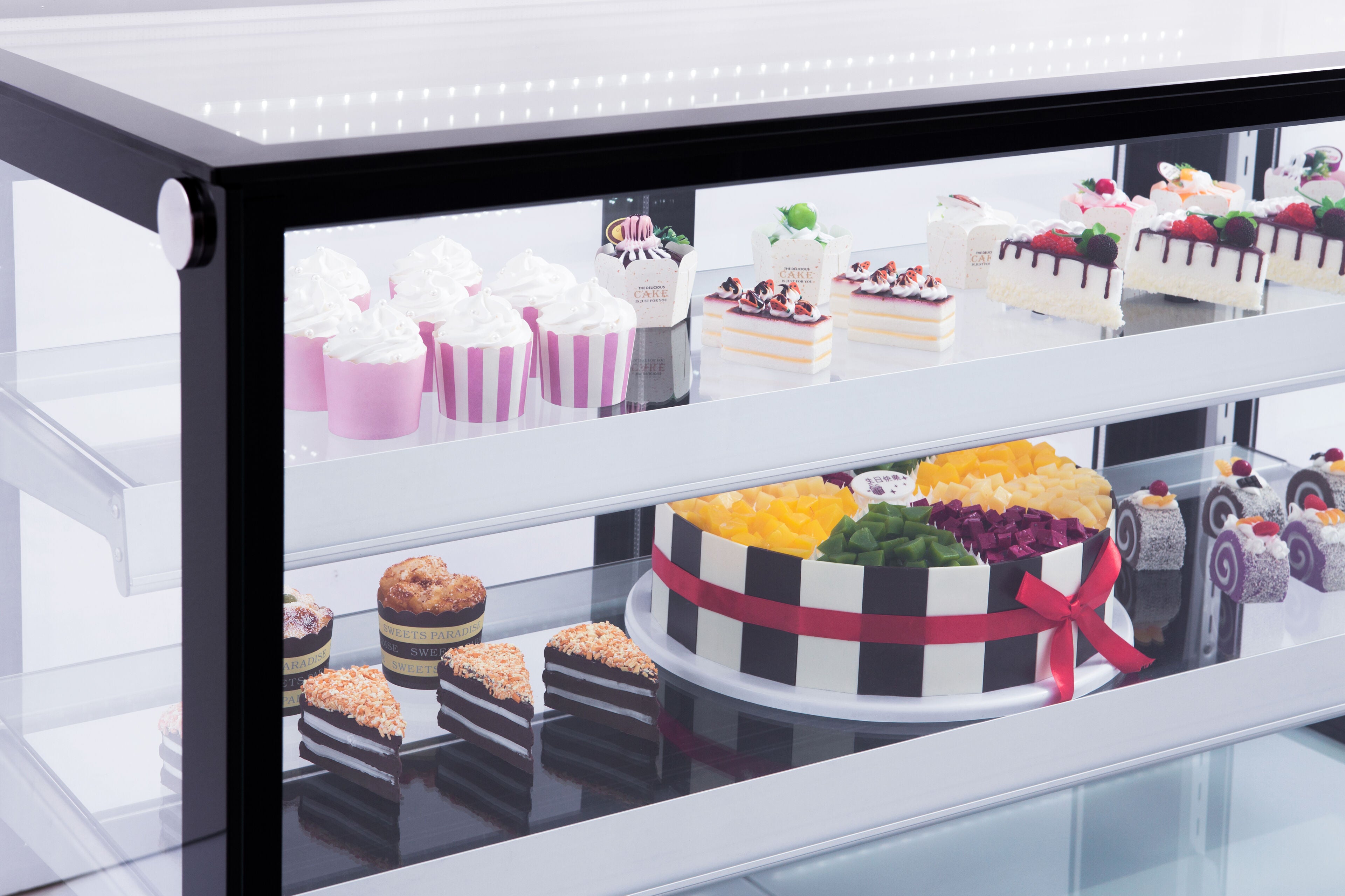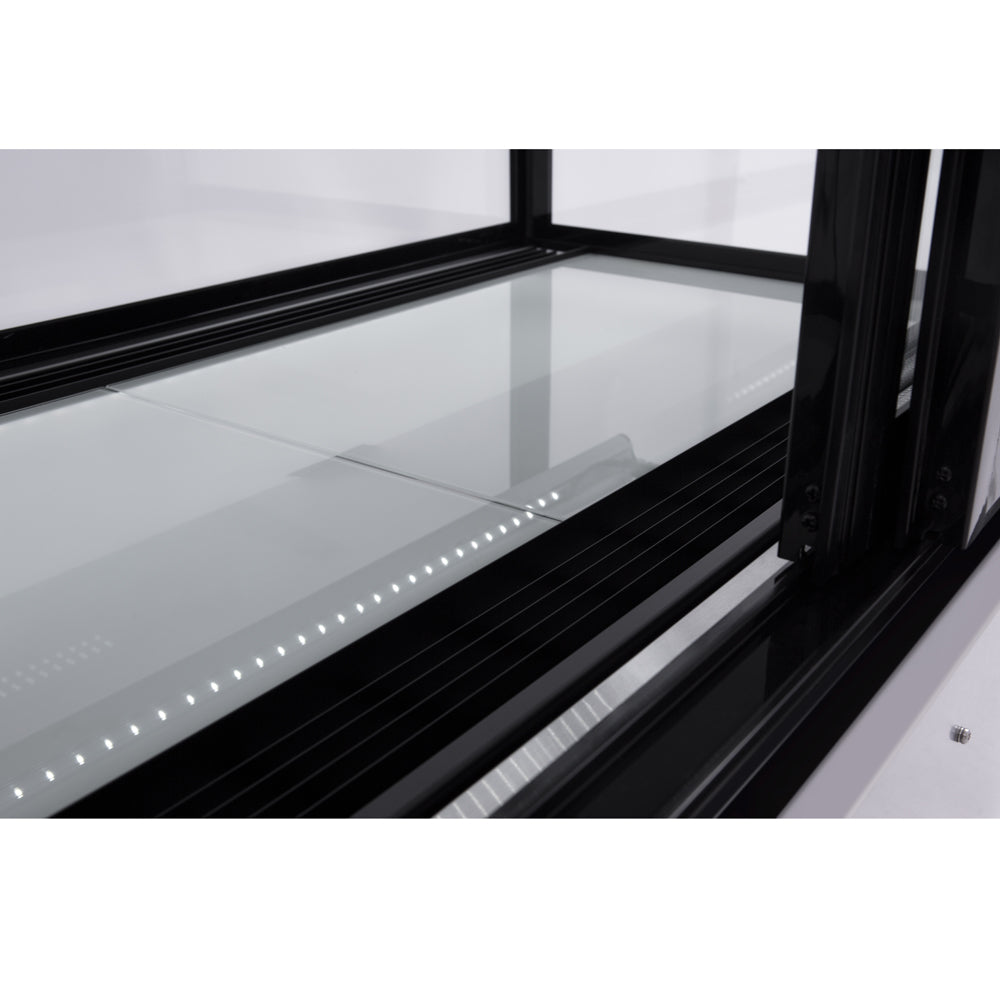 This unit features a 4-sided, double glass design for maximum product visibility, while the rest of the exterior is a sleek, black color to draw attention to the treats on display. Plus, the built-in LED lighting illuminates your product for a bright, enticing display.