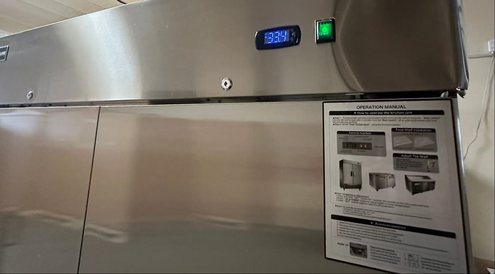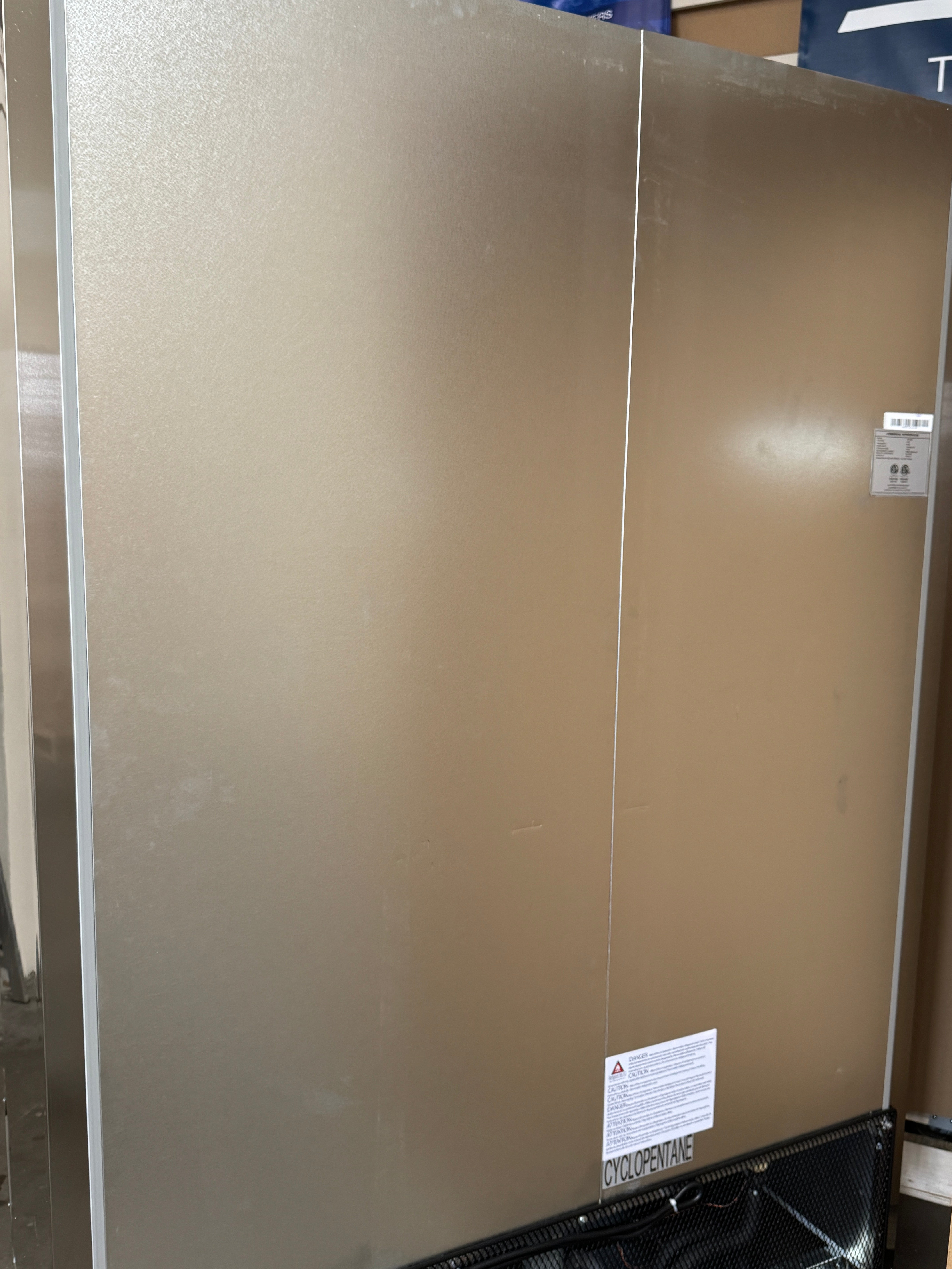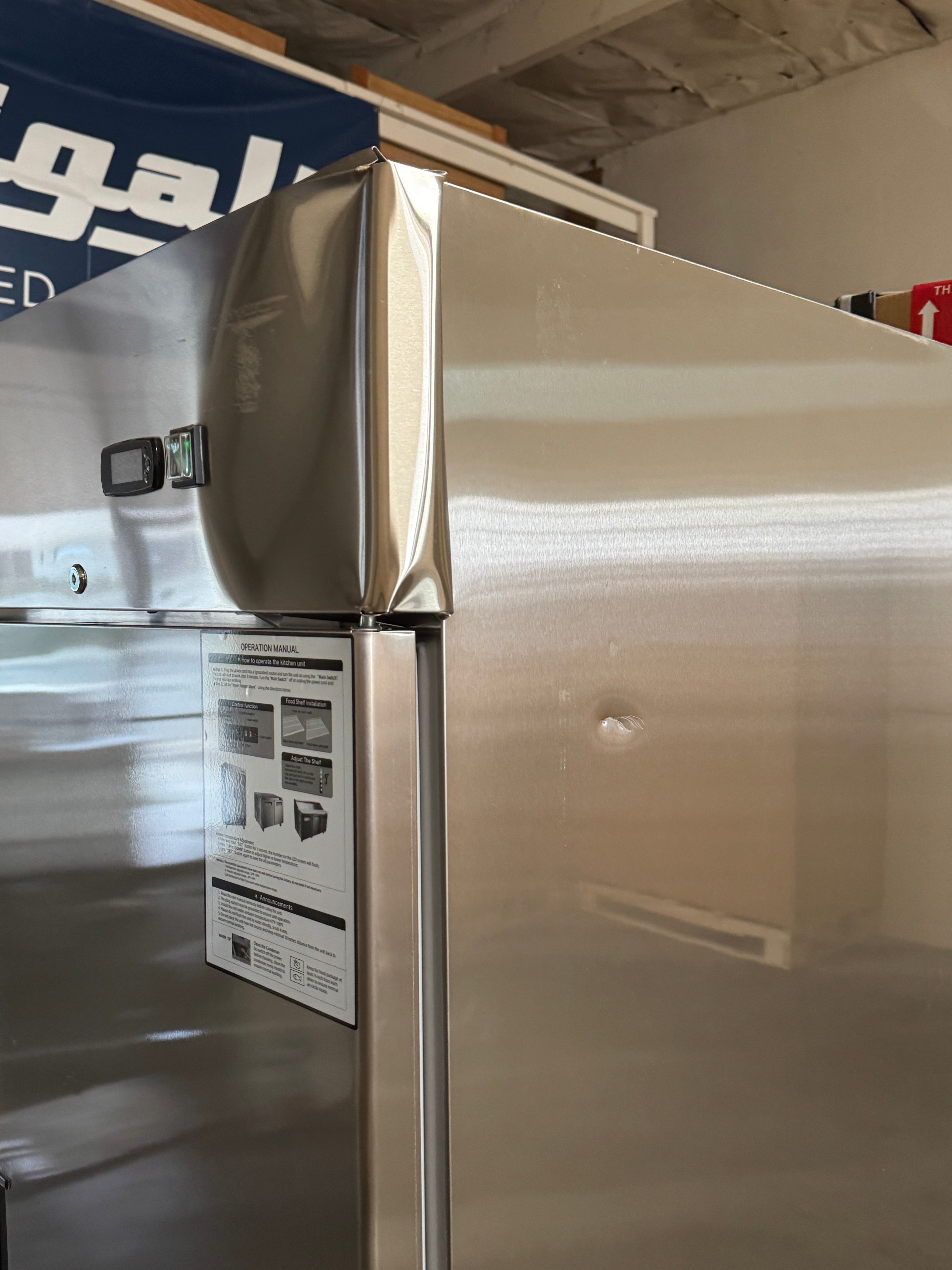The unit is brand new and cooling properly; however, it sustained shipping damage to the top panel and left door, along with cosmetic dings and dents on the side and back panel.