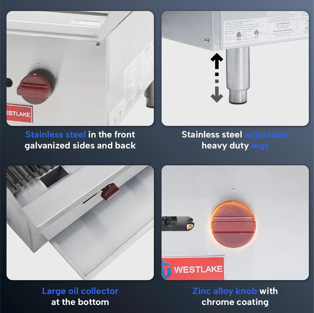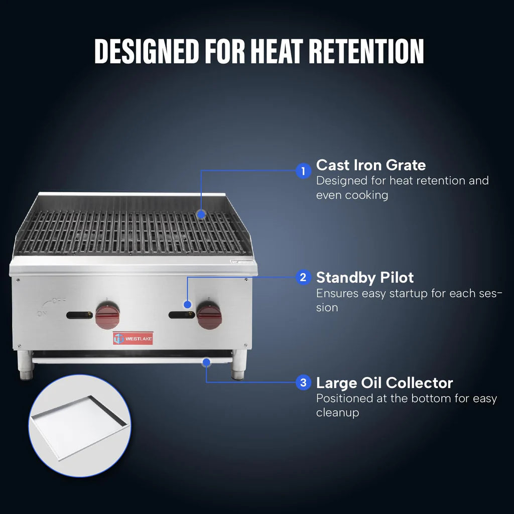 Commercial Charbroiler, WESTLAKE 24" Gas Countertop Radiant Charbroiler 2 Burner Char Broiler - 60,000 BTU