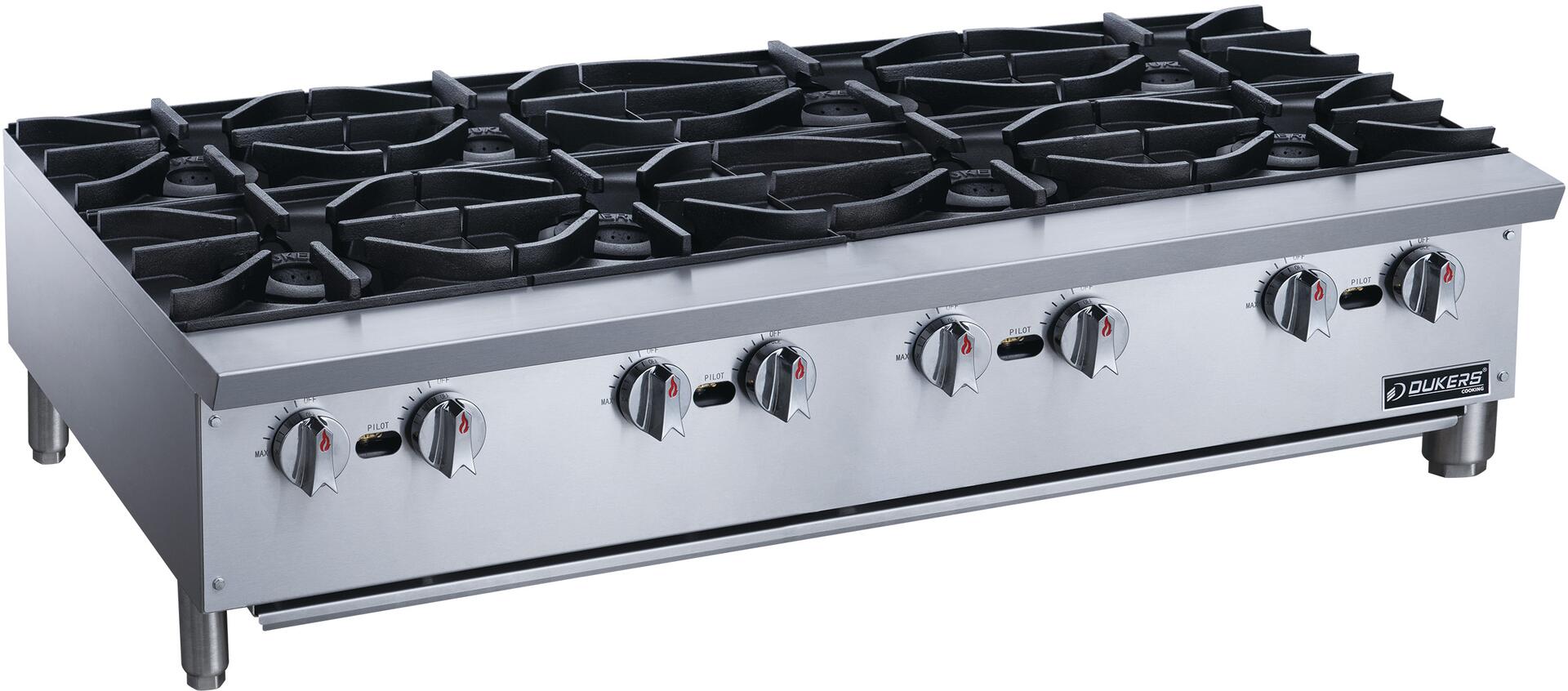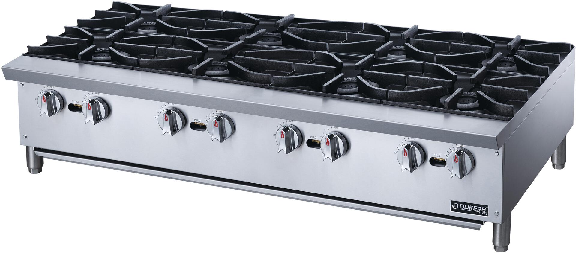 The Dukers DCHPA48 hot plate with 8 burners features 28,000 BTUs and works with natural gas or liquid propane.