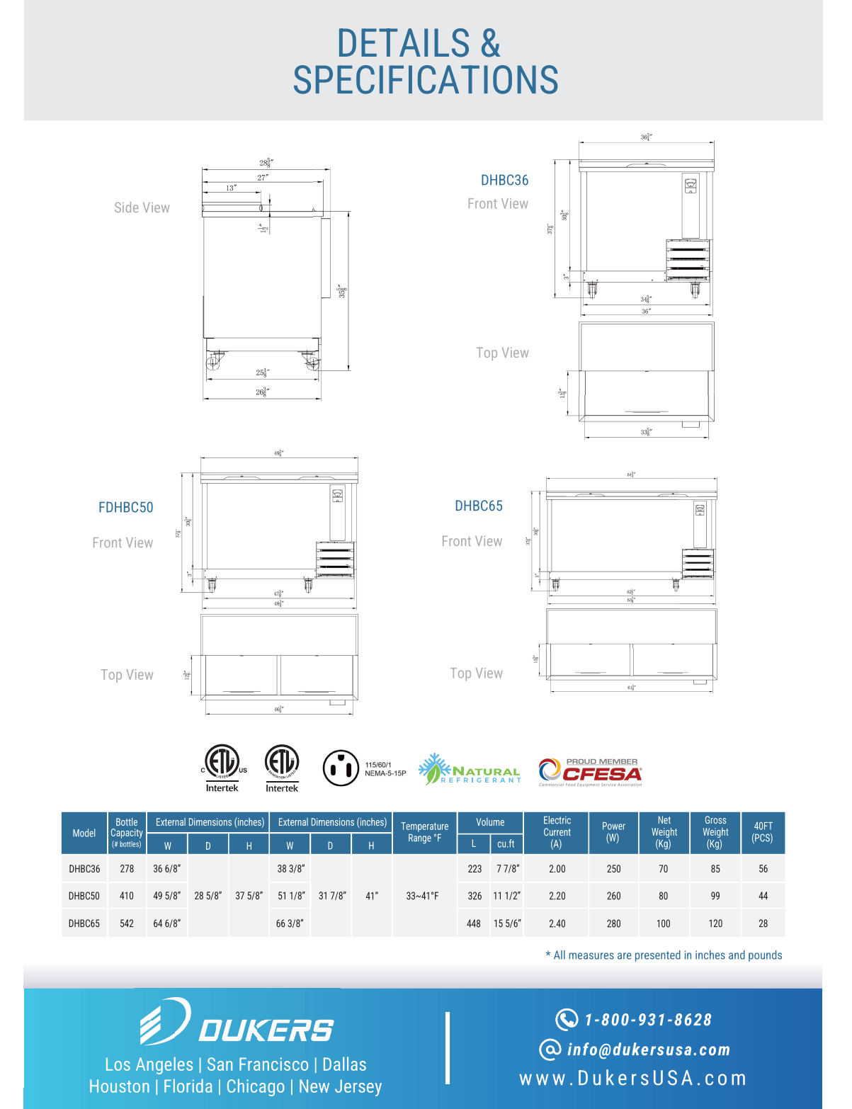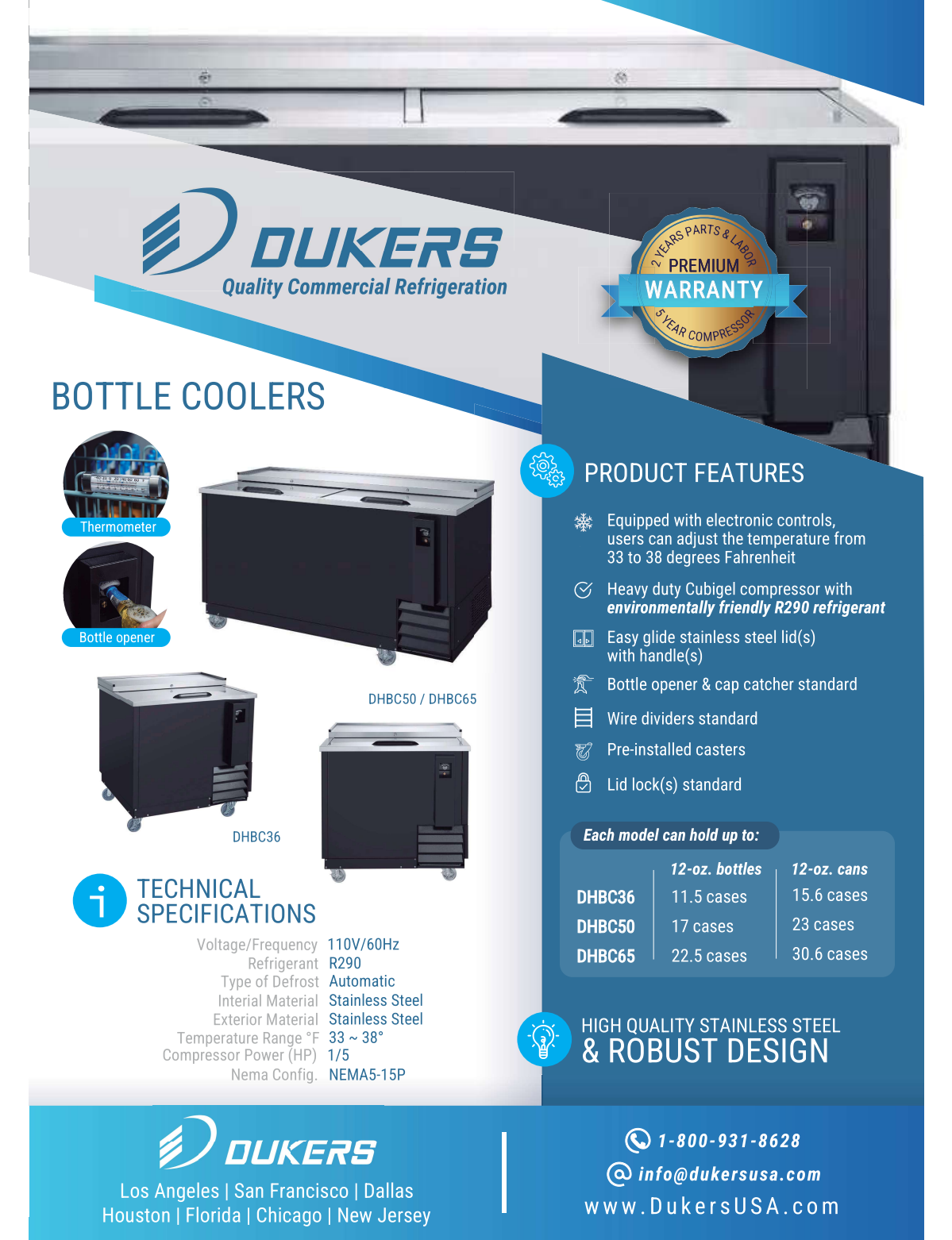 Dukers DHBC65 Bottle Cooler has 15-5/6 cu.ft. accepts 22 case capacity 12 oz bottles. The unit’s temperature ranges from 33 to 41 degrees Fahrenheit and is maintained by R290 hydrocarbon refrigerant in the self-contained capillary tube system.