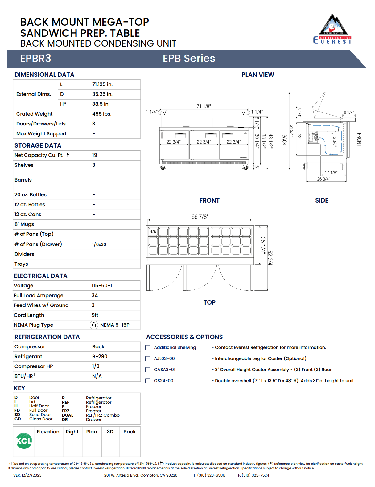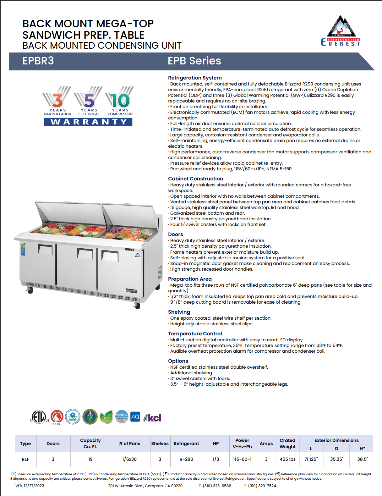 The Everest Refrigeration EPBR3 is a commercial-grade, three-section sandwich prep table designed for efficient mid- to high-volume food preparation. Constructed with stainless steel on the front, top, and sides, and galvanized steel on the back and bottom, this unit offers durability, sanitation, and professional-grade performance.