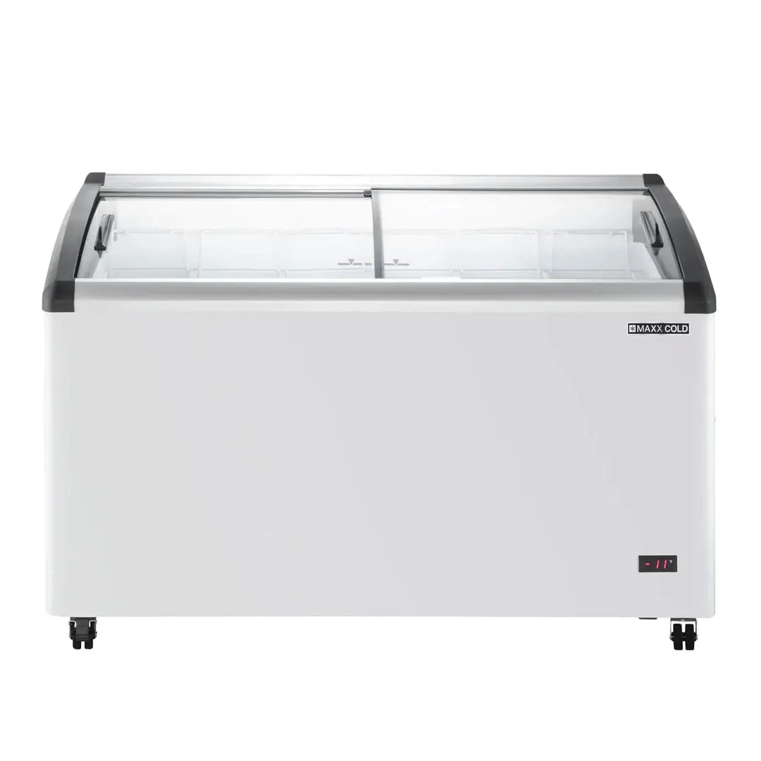 This line of Glass Display Freezer Merchandisers offer a spacious interiors that allow you to store ice cream and frozen novelties in an elegant presentation, with size options to meet your specific application requirements. Capacities range from 3.8 to 14.3 cubic feet (108 to 405 liters). Each unit has thick wall insulation and a white powder coated finish for easy cleaning.