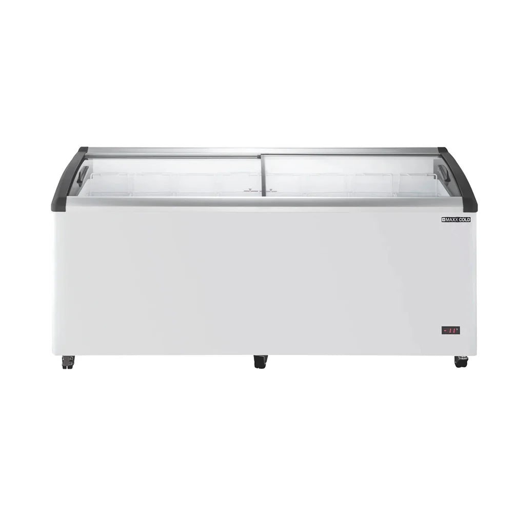 Maxx Cold X-Series Chest Freezer Ice Cream Merchandiser, mobile, 14.30 cu. ft., (8) flat wire baskets with 3 compartments, clear curved glass sliding lids, lid lock & keys, interior LED lights, digital temperature display, -18° to 10°F temperature range, internal condensate evaporator pan, removable rubber bumper guards & side grill, self-contained side mounted cold wall refrigeration system, white zinc coated, baked on enamel steel exterior, painted white powder coated steel interior, heavy-duty casters, R290a Hydrocarbon refrigerant, 1/2 HP, 2.8 amps, 120v/60/1-ph, cord, NEMA 5-15P, CE, ETL-Sanitation, cETLus, DOE 2018 Compliant, SNAP 2020 Compliant