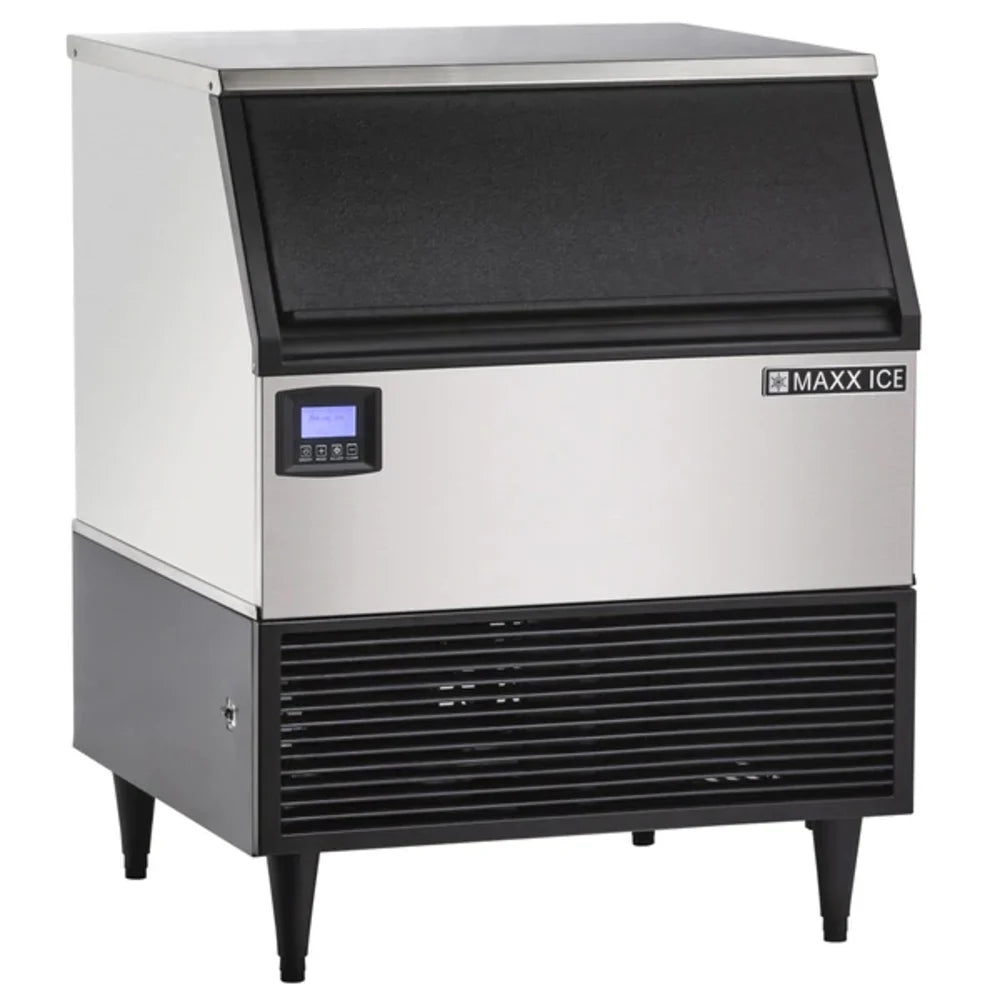 Simpler to install and maintain than remote systems, the Maxx Ice MIM320NH Intelligent ice machine is self-contained and air cooled. This 30-inch-wide by 28-inch-deep by 39-inch-tall unit features a front-breathing design compatible with freestanding or built-in applications for flexibility in installation. To complement existing pieces of equipment, it sports a rugged stainless steel exterior with black plastic trim. Because it's mounted on adjustable 6-inch legs, it can be raised or lowered to level the unit on uneven flooring, minimizing disruptive rocking or wobbling during operation and ice retrieval. For convenience, this unit is equipped with a 100-pound-capacity ice bin. The bin's polyethylene liner is treated with an antimicrobial agent that inhibits microbial growth between regularly scheduled cleanings. A blue LED interior light illuminates the storage bin's interior to enhance staff visibility when retrieving ice, while an internal scoop holder positions the included ice scoop in place for sanitary storage.