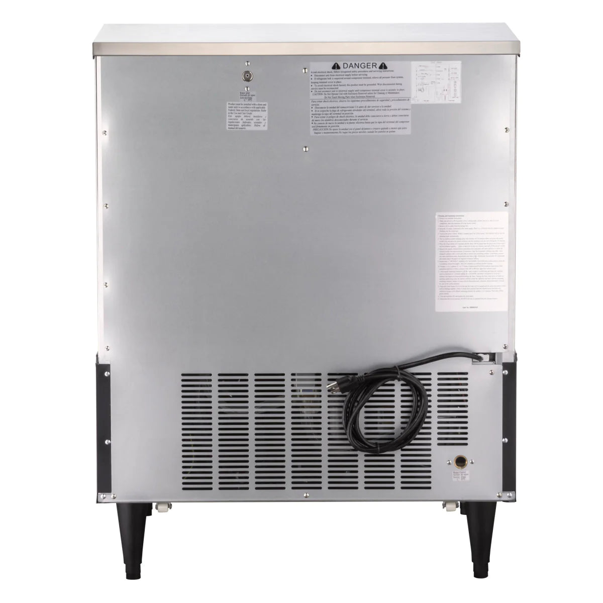 Digital Undercounter Ice Maker With Bin, cube-style (half dice), air-cooled, self-contained condenser, approximately 328 lb. production/24 hours, 100 lb. built-in storage capacity, digital display & controls, automatic cleaning, overflow prevention, internal LED light, stainless steel exterior with black trim, 6" adjustable legs, R404a refrigerant, NSF, cULus Classified