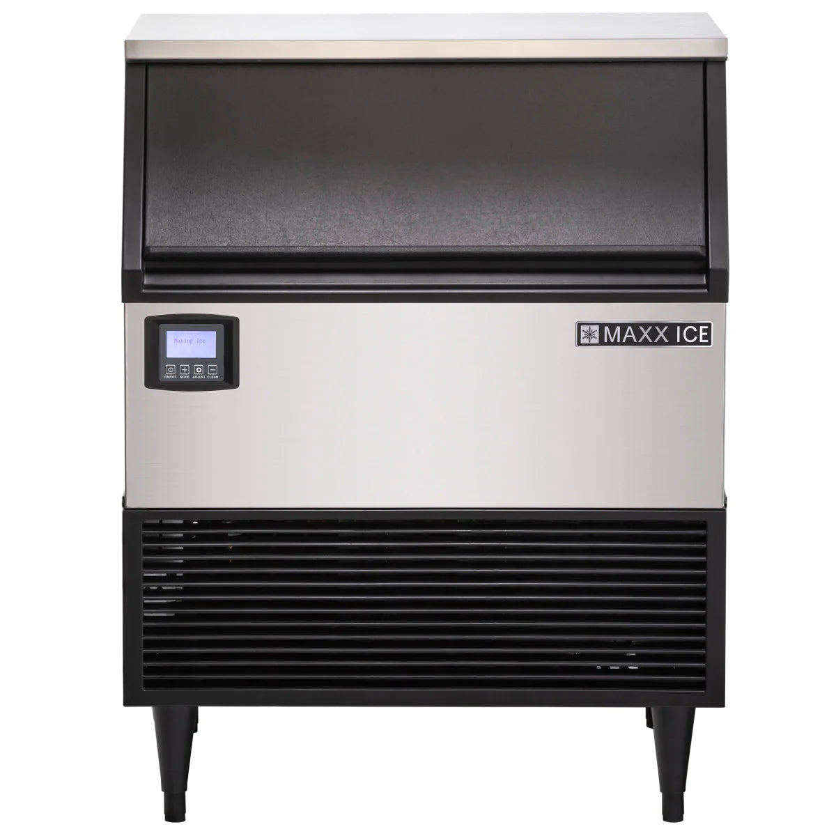 Great for high-traffic establishments selling bagged ice, dispensed ice, soft drinks, or smoothies, the Maxx Ice MIM320NH undercounter ice maker produces half-cube ice. Each cube measures 22⁄25 inches by 1⁄2 inches by 22⁄25 inches to cool drinks quickly and displace liquid. To produce 328 pounds of ice in 24 hours, incoming water must be 50 degrees Fahrenheit, and ambient air must be 70 degrees Fahrenheit. Operators can adjust settings with the user-friendly digital controls, while the external digital display provides temperature and status readouts. For simplified maintenance, this unit features an automatic cleaning cycle, bin overflow protection, and a removable air intake filter.