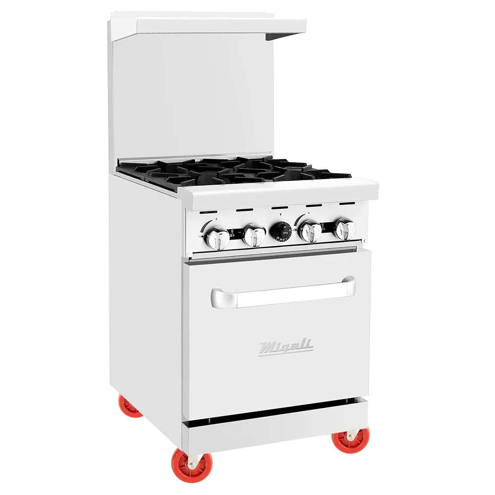 Because it has both a burner cooktop and an oven, the Migali C-RO4-LP Competitor Series® gas range can cook two types of food at once, providing efficiency in a busy restaurant. The burners operate at 23,000 BTU each and have cast iron grates that are removable for cleaning underneath. Using chrome knobs, operators can adjust the temperature, and a high-limit control shuts off the unit if temperatures get too high for safety purposes.