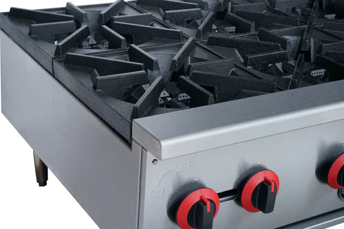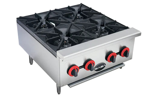 SABA gas hot plate range is the perfect solution when there isnt enough floor space for a full-size range. This high efficiency, stainless steel counter top range can be the perfect over the counter solution in any size kitchen to prepare a variety of foods quickly and easily. Each heavy duty cast iron burner consists of 25,000 BTU/hr for optimal efficiency. The SABA gas hot plate come in natural gas, however can be easily converted to propane with an included conversion kit. These hot plate ranges come in 3 different sizes: 2, 4, or 6 burners to fit any countertop size and need.
