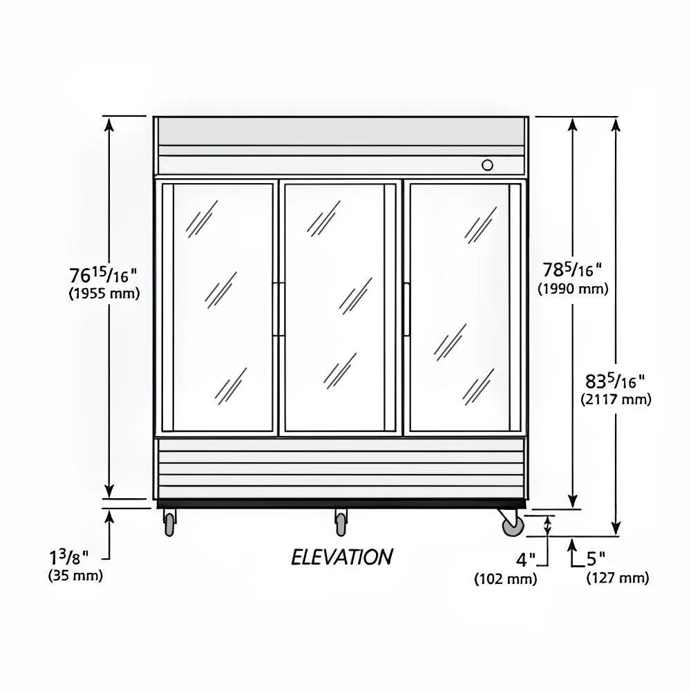 The True T-72G-HC~FGD01 three-section refrigerator is built with double-pane, low-emissivity glass doors, preventing excessive heat from penetrating the doors to help keep the unit energy efficient. Each door has a 15-inch-long extruded handle and magnetic gaskets that prevent cold air from seeping out. Foamed-in-place polyurethane insulation fills the entire cabinet, and it is constructed of stainless steel and aluminum to resist corrosion and dents.