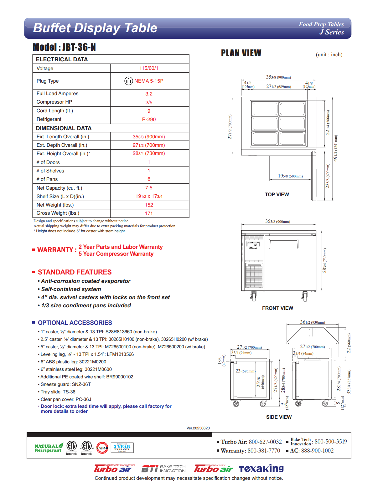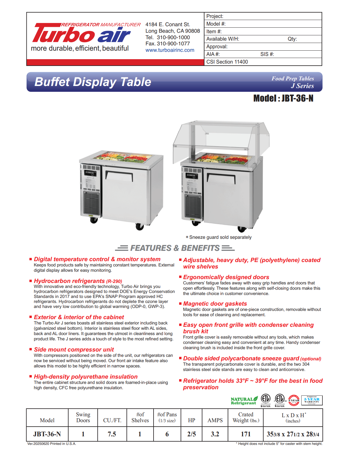 J Series Refrigerated Buffet Table, one-section, front air intake, side mount self-contained compressor, 35-3/8″W x 27-1/2″D x 28-3/4″H, 7.5 cu. ft., (6) 1/3 size 4″ deep pans, (1) solid door, (1) PE coated wire shelf, digital temperature control, stainless steel exterior (galvanized steel bottom), stainless steel interior floor (aluminum side, back, door liner), R290 Hydrocarbon refrigerant, 2/5 HP, 115v/60/1-ph, 3.2 amps, NEMA 5-15P, cETLus, ETL-Sanitation