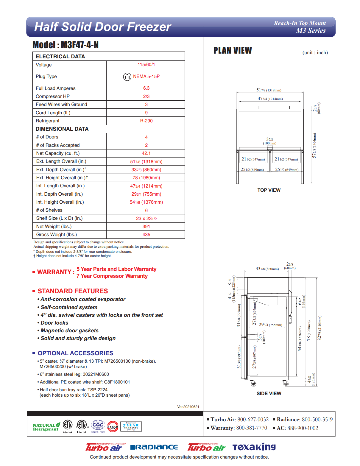 M3 Freezer, reach-in, two-section, 42.1 cu. ft., 51-7/8″W x 33-7/8″D x 78″H, LED digital thermometer, self-diagnostic monitoring system, hot gas condensate system, smart fuzzy defrost, automatic fan motor delays, door pressure release, LED interior lighting, self-cleaning condenser device, (4) half hinged solid doors with recessed handle & locks, (6) PE coated wire shelves, stainless steel front & sides (galvanized steel top, bottom & back), aluminum interior with stainless steel floor, top mount self-contained compressor, R290 Hydrocarbon refrigerant, 2/3 HP, 115v/60/1-ph, 6.3 amps, NEMA 5-15P, cETLus, ETL-Sanitation