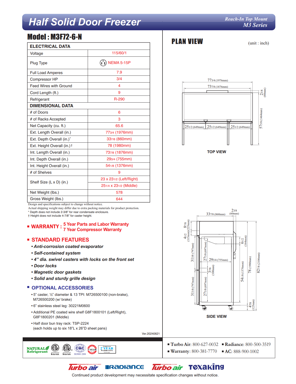 M3 Freezer, reach-in, three-section, 65.6 cu. ft., 77-3/4″W x 30-3/4″D x 78″H, digital thermometer, self-diagnostic monitoring system, hot gas condensate system, smart fuzzy defrost, automatic fan motor delays, door pressure release, LED interior lighting, self-cleaning condenser device, (6) half hinged solid doors with recessed handle & locks, (9) PE coated wire shelves, stainless steel front & sides (galvanized steel top, bottom & back), aluminum interior with stainless steel floor, top mount self-contained compressor, R290 Hydrocarbon refrigerant, 3/4 HP, 115v/60/1-ph, 7.9 amps, NEMA 5-15P, cETLus, ETL-Sanitation