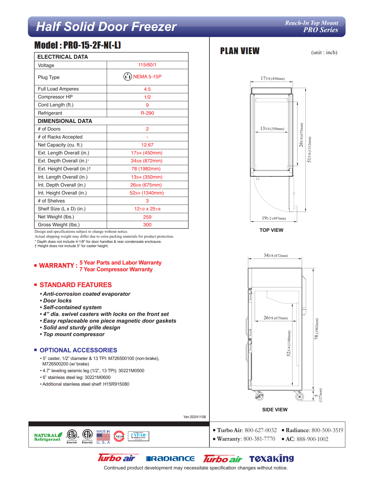 PRO Series, Reach in, Freezer, 2 half solid doors, Self-Cleaning Condenser equipped, Digital temperature control & monitor system, Hydrocarbon refrigerants (R-290), Cold air distribution system, Hot gas condensate system, All stainless steel cabinet construction and shelving, LED interior lighting, USB temperature data storage, High-density polyurethane insulation, Lifetime guaranteed heavy duty hinges and handles, Built to maintain NSF standard temperatures in 100F ambient, 115V/60/1, NEMA 5-15P, 4.5 Amp, 1/2 HP, 12.67 cu. ft., cETLus, ETL, MADE IN USA, Lead time applies