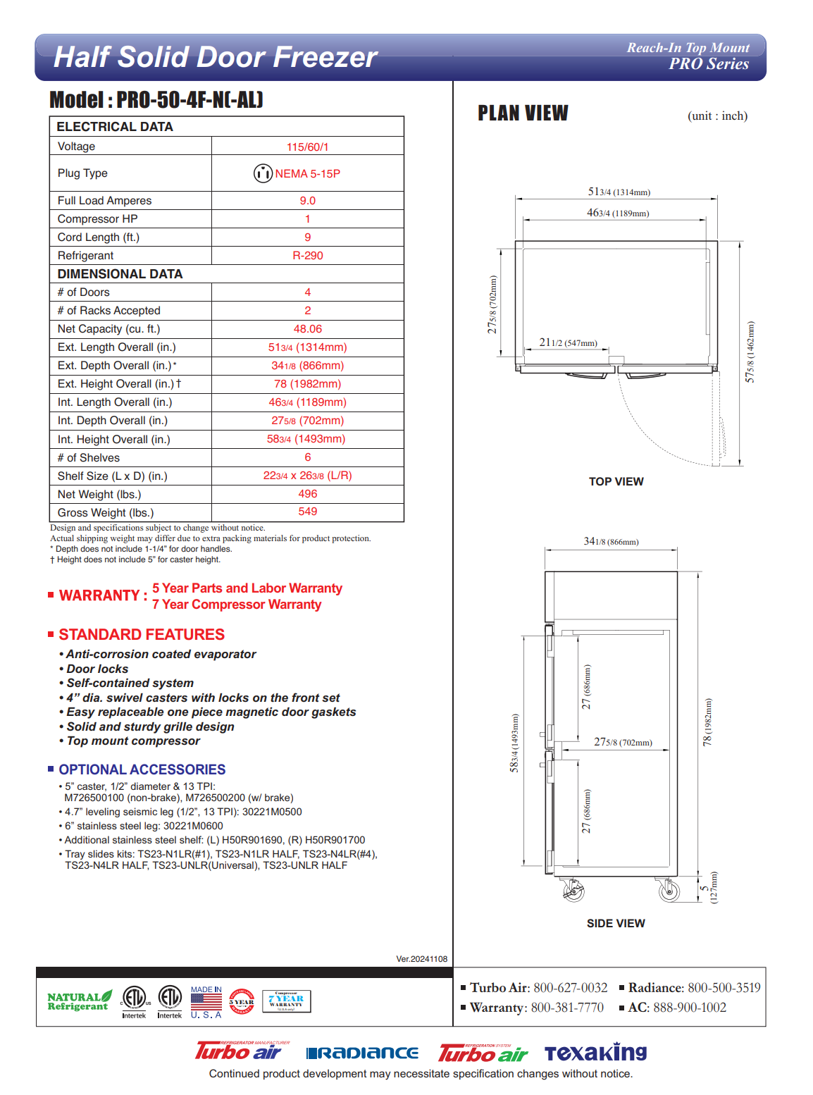 PRO Series Freezer, reach-in, two-section, 48.06 cu. ft. capacity, 51-3/4″W x 34-1/8″D x 78″H, top mount self-contained refrigeration, self-cleaning condenser device, digital temperature controller, self-diagnostic monitoring system, hot gas condensate system, automatic fan motor delays, (4) half-hinged solid stainless steel doors with locks, lifetime guaranteed heavy duty hinges & handles, LED interior lighting, (6) stainless steel wire shelves, stainless steel interior & exterior (galvanized top & bottom), R290 Hydrocarbon refrigerant, 1 HP, 115v/60/1-ph, 9.0 amps, NEMA 5-15P, cETLus, ETL-Sanitation, Made in USA (contact sales for lead time)