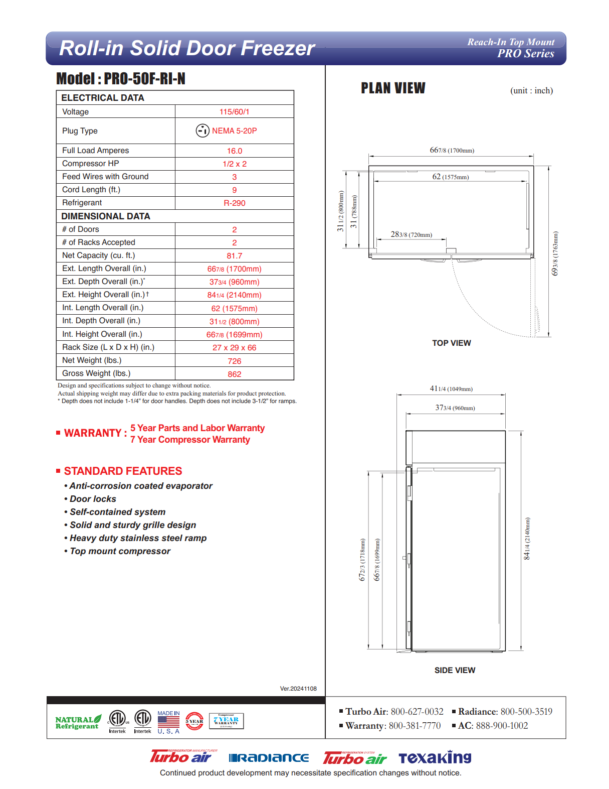 PRO series Reach-in roll-in freezer, Two-section, Self-Cleaning Condenser equipped, Self-contained, Stainless steel interior and exterior (galvanized steel top, bottom and back), (2) hinged solid doors with recessed handle,Digital temperature control & monitor system, Self-diagnostic monitoring system, Door-open alarm beeps, Automatic fan motor delays, Hot gas condensate system, LED interior lighting, Door locks, 4″ dia. swivel casters, Top mount compressor, Anti-corrosion coated evaporator, Lifetime guaranteed heavy duty hinges and handles, Maintains NSF standard temperatures in 100°F ambient, 81.7 cu.ft., 115v/60/1, NEMA 5-20P, 16 Amps, 2 x 1/2 HP, ETL-Sanitation, cETLus, MADE IN USA