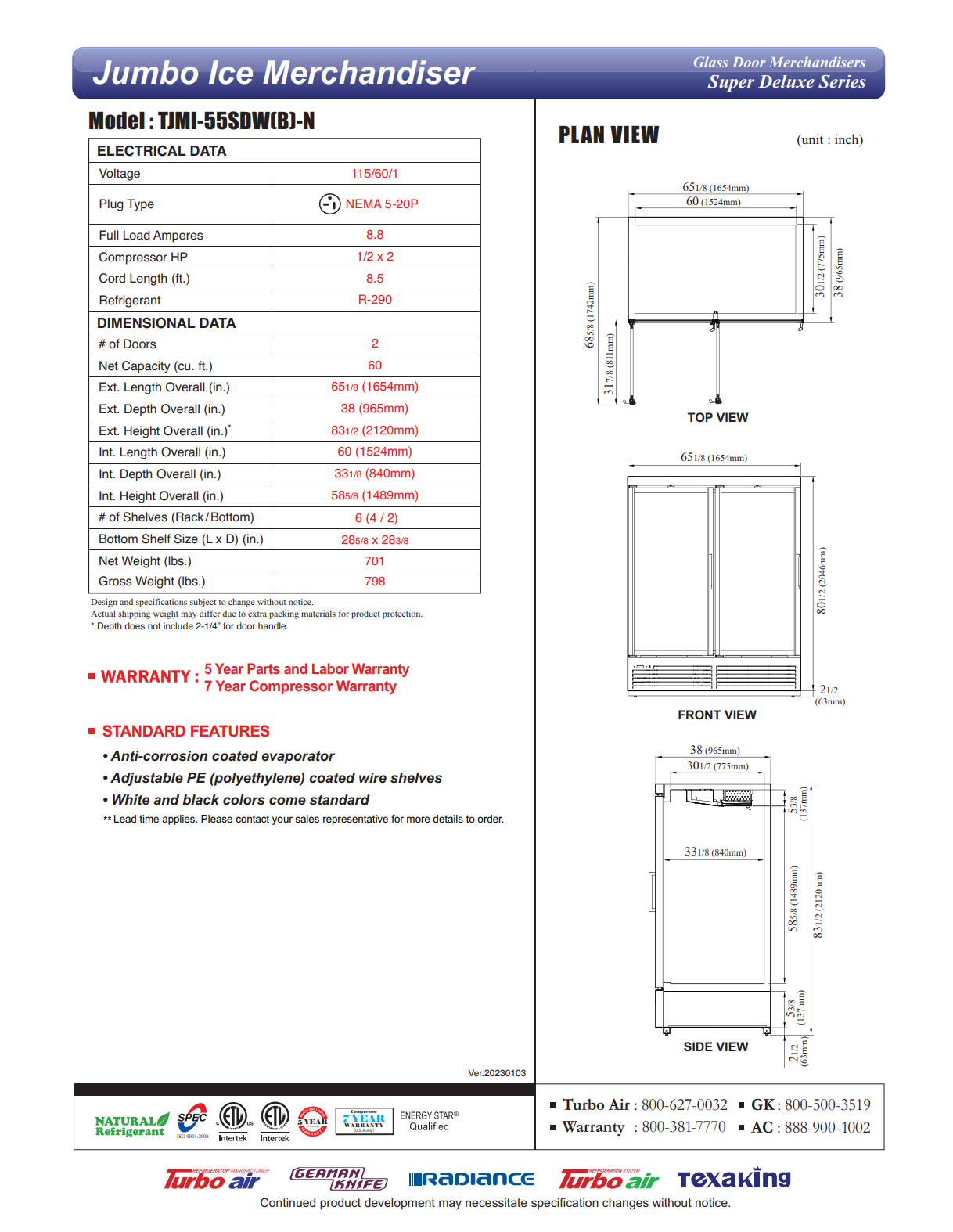 Super Deluxe Jumbo Ice merchandiser, two-section, 60 cu.ft. capacity, 65-1/8″L x 38″D x 83-1/2″H, bottom mount self-contained refrigeration, self-cleaning condenser device, digital temperature controller, self-diagnostic monitoring system, automatic fan motor delays, Turbo freezing, smart fuzzy defrosting, (2) triple pane heated glass doors, LED interior lighting, (4) rack shelves, (2) bottom shelves, R290 Hydrocarbon refrigerant, (2) 1/2 HP, 8.8 amps, 115v/60/1-ph, cord, NEMA-5-20P, cETLus, ETL-Sanitation