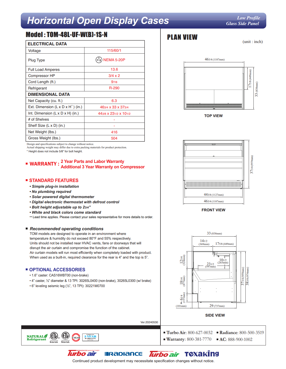 Horizontal Open Display Merchandiser, low-profile, 6.3 cu. ft. capacity, 46-3/4″W x 33″D x 37-3/4″H, self-contained refrigeration with self-cleaning condenser, tempered glass front shield & side panels, stainless steel interior, deck only, digital electronic thermostat with defrost control, solar digital thermometer, LED interior lighting, specify exterior color, includes night cover, front air intake & rear air discharge, R290 Hydrocarbon refrigerant, (2) 3/4 HP, 115v/60/1-ph, 13.6 amps, cord with NEMA 5-20P, cETLus, ETL-Sanitation (Contact sales for lead time)